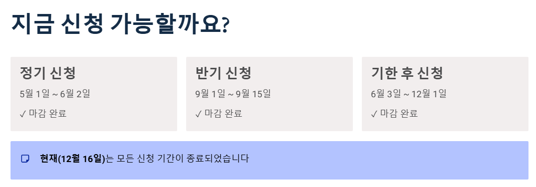 - 12월 16일 현재, 모든 신청 기간(기한 후 포함) 종료됨. (신청 불가)