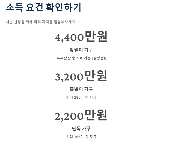 - 홑벌이 가구: 3,200만 원 미만 (최대 285만 원 지급)