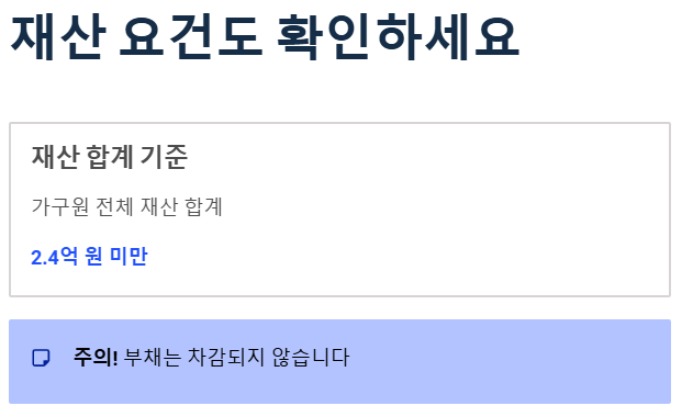 - 재산 요건: 가구원 전체 재산 합계 2.4억 원 미만 (부채 차감 안 됨)