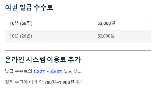 - 예시: 신용카드나 간편결제로 53,000원 여권을 결제하면, 약 700원~1,900원 정도가 추가되어 최종 결제됩니다.