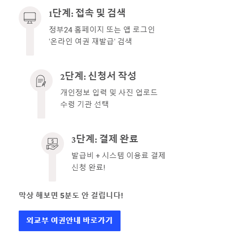 하지만 '여권 재발급 온라인 신청'을 이용하면 신청은 집에서 5분 만에 끝내고,
