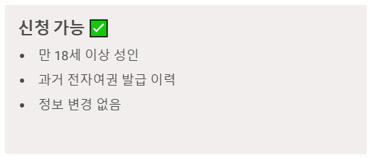- 신청 가능 대상: 만 18세 이상 우리 국민 중, 과거에 전자여권(일반여권)을 한 번이라도 발급받은 적이 있는 사람