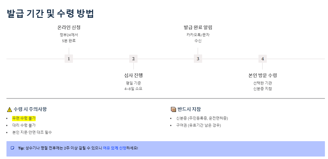 4. 발급 기간 및 수령 방법 (우편 수령 불가!) ⏳