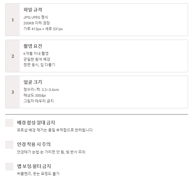 | 표정/눈 | 입 다물기, 정면 응시 | 입 벌림, 웃음, 써클렌즈 절대 불가 |