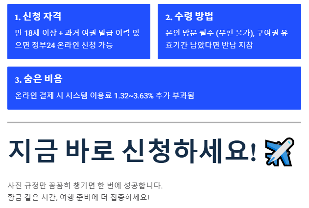 - 수령은 반드시 본인 방문 (우편 불가), 유효기간 남은 기존 여권은 반납 필수.
