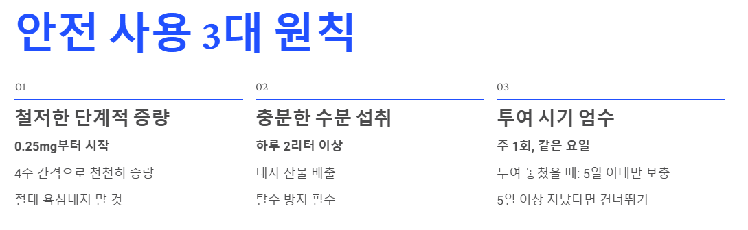 - 철저한 단계적 증량: 절대 욕심내지 말고 0.25mg부터 4주 간격으로 천천히 증량해야 위고비 부작용을 최소화할 수 있습니다.
