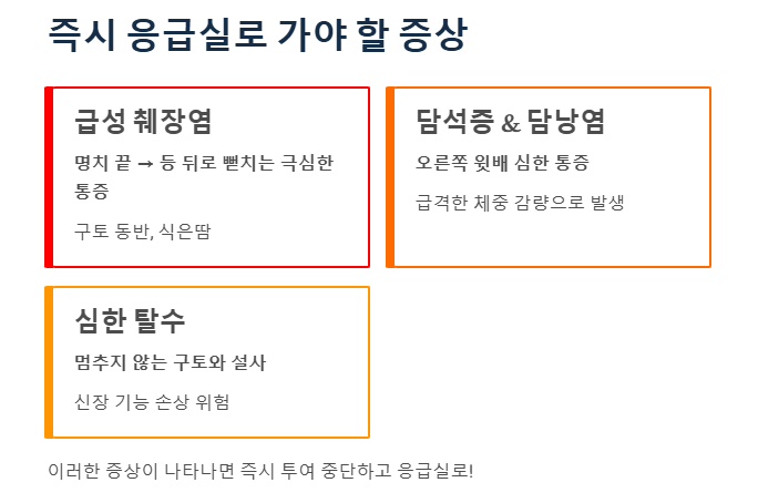 - 응급 상황: 등까지 아픈 복통이나 심한 구토 등 위험한 위고비 부작용 신호가 오면 즉시 응급실로 가야 합니다.