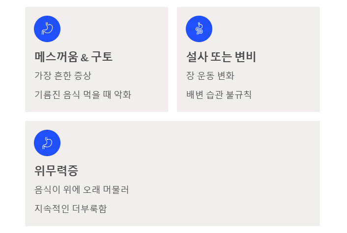 - 메스꺼움 및 구토: 가장 흔하며, 기름진 음식을 먹었을 때 심해집니다.