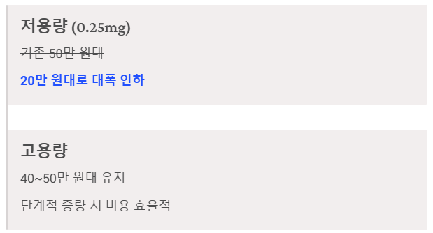 - 가격 인하: 저용량(0.25mg)은 기존 50만 원대에서 20만 원대까지 대폭 인하되었습니다. (고용량은 40~50만 원대 유지)