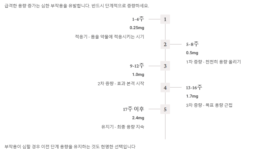 - 적응기 (1~4주): 0.25mg 최저 용량으로 시작해 4주간 몸을 적응시키는 것이 정석적인 위고비 사용법입니다.