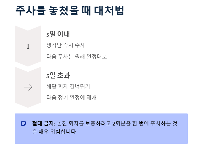 - 5일 이내라면: 생각난 즉시 주사하고, 다음 주사는 원래 일정대로 맞으세요.