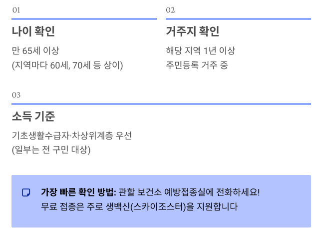 - 지원: 만 65세 이상이라면 보건소에 전화해 무료 접종 대상인지 먼저 확인하세요.