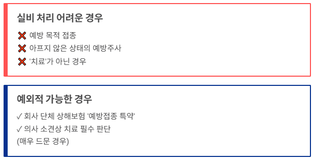 가장 많이 묻는 질문 중 하나죠. 결론부터 말씀드리면 "예방 목적의 접종은 실비 처리가 어렵습니다."