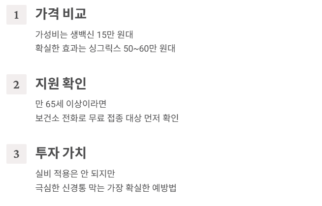 - 가격: 가성비는 '생백신(15만 원대)', 확실한 효과는 '싱그릭스(총 50~60만 원대)'입니다.