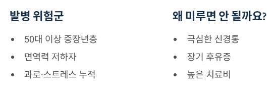 - 관리: 실비 적용은 안 되지만, 예방접종은 극심한 신경통을 막아주는 가장 확실한 투자입니다.