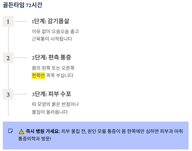 💡 팁: 피부에 물집이 올라오기 전, 원인 모를 통증이 몸 한쪽(가슴, 배, 얼굴 등)에만 심하게 느껴진다면 즉시 피부과나 마취통증의학과를 방문하세요.