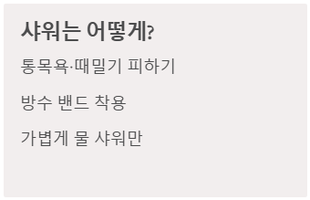 - 물집이 터지면 2차 세균 감염이 일어날 수 있습니다. 통목욕이나 때밀기는 피하시고, 방수 밴드를 붙인 채 가볍게 물 샤워만 하세요.