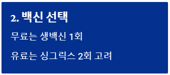 - 백신 선택: 무료는 주로 '생백신(1회)'이며, 유료로 확실한 효과를 원하면 '싱그릭스(2회)'를 고려하세요.