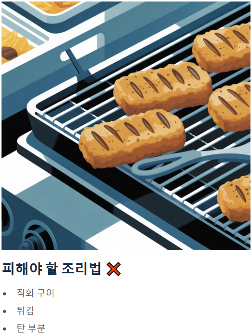 - 비추천: 직화구이, 튀김 (탄 부분은 절대 금물!)