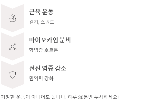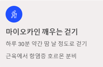 - 근육에서 나오는 항염 물질 '마이오카인' 분비를 위해 하루 30분만 걸으세요.
