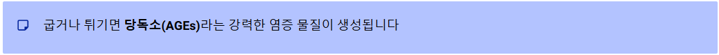 같은 재료라도 굽거나 튀기면 '당독소(AGEs)'라는 강력한 염증 물질이 폭발합니다.
