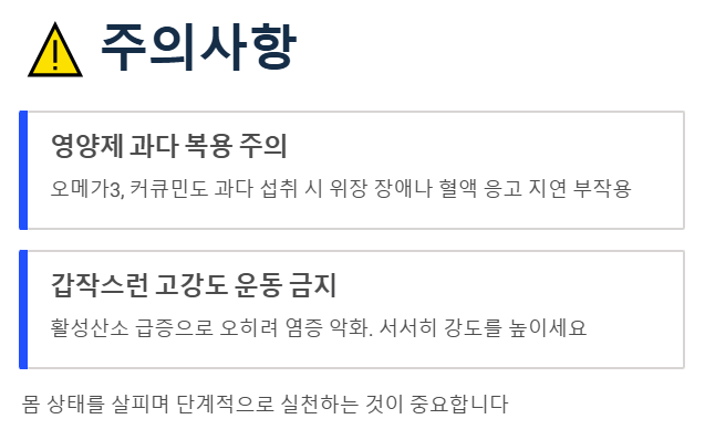 - 영양제 과다 복용 주의: 항염증 효과가 있다는 오메가3나 커큐민도 과다 섭취 시 위장 장애나 혈액 응고 지연 등의 부작용이 있을 수 있습니다.