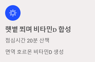 비타민D는 단순한 비타민이 아니라 면역 호르몬에 가깝습니다. 비타민D 농도가 낮을수록 염증 수치가 높다는 연구 결과가 많아요. 점심시간에 20분 정도 산책하며 햇볕을 쬐어주세요.