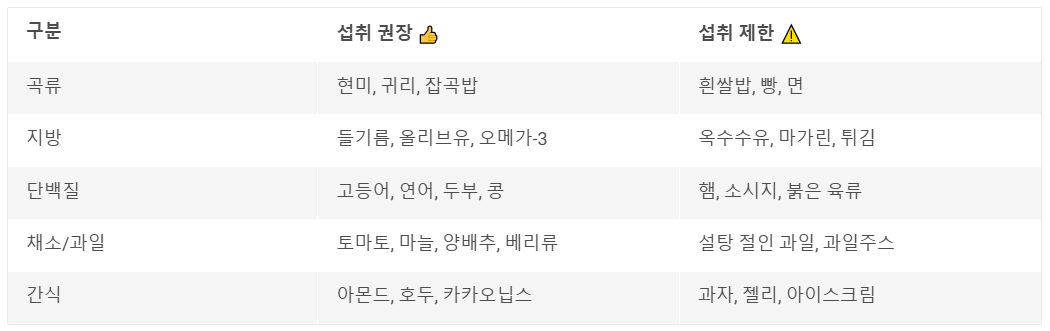 | 단백질 | 고등어, 연어, 두부, 콩 | 햄, 소시지, 붉은 육류(과다) |