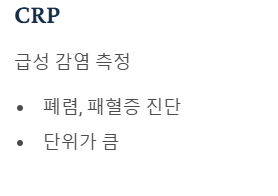 - 일반 CRP: 폐렴, 패혈증 등 급성 감염을 잡아내는 데 사용 (단위가 큼)