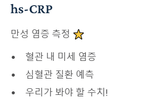 - hs-CRP: 혈관 내 미세한 만성 염증을 측정하여 심혈관 질환 위험을 예측 (우리가 봐야 할 수치!)