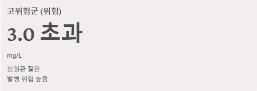 | 고위험군 (위험) | 3.0 초과 | 심혈관 질환 발병 위험 높음, 재검 필요 |