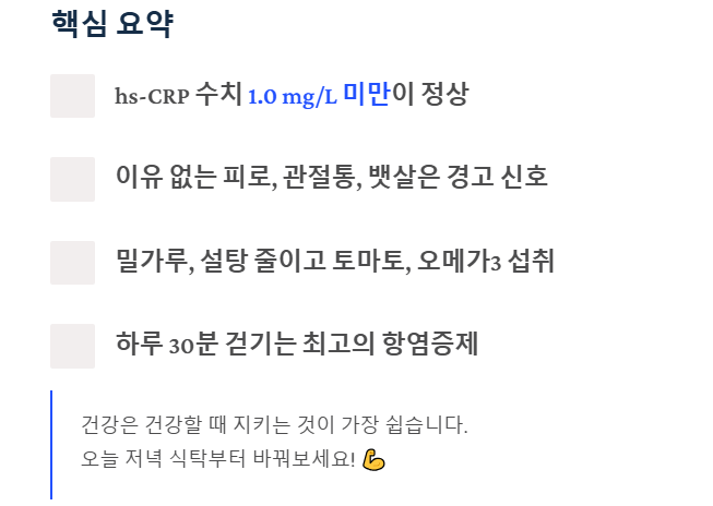 - 만성 염증 확인은 hs-CRP 수치를 봐야 하며, 1.0 mg/L 미만이 정상입니다.