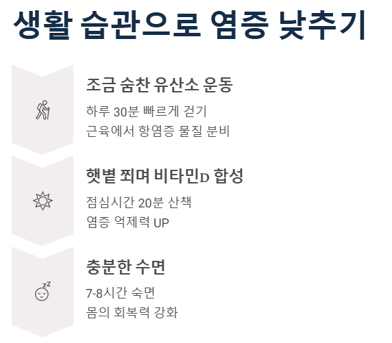 비타민D가 부족하면 염증 억제력이 떨어집니다. 점심시간에 20분 정도 산책하며 햇볕을 쫴주세요.