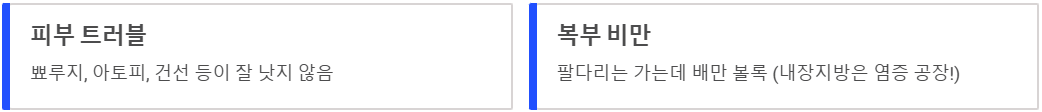 - 복부 비만: 팔다리는 가는데 배만 볼록 나온 경우 (내장지방은 염증 공장입니다!).