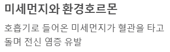 - 미세먼지와 환경호르몬: 호흡기로 들어온 미세먼지는 혈관을 타고 돌며 전신 염증을 일으킵니다.