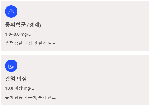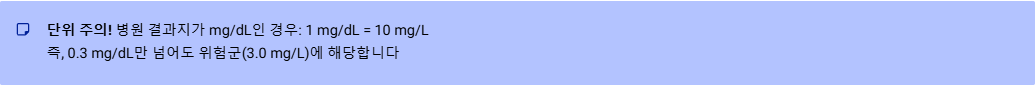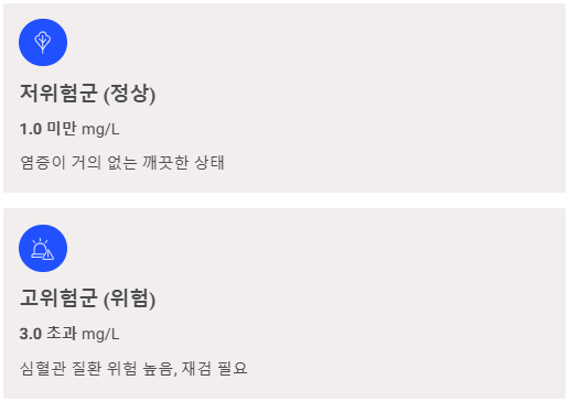 즉, 0.3 mg/dL만 넘어도 위험군(3.0 mg/L)에 해당합니다.