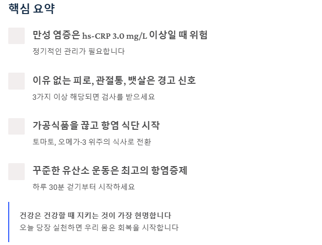 - 만성 염증은 hs-CRP 3.0 mg/L 이상일 때 위험하며 관리가 필요합니다.