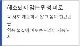 - 해소되지 않는 만성 피로: 푹 자도 개운하지 않고 몸이 천근만근 무겁습니다. 염증 물질이 미토콘드리아의 기능을 저하시키기 때문입니다.