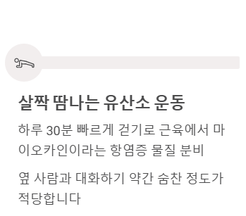 근육에서 '마이오카인'이라는 항염증 물질을 나오게 합니다. 옆 사람과 대화하기 약간 숨찬 정도가 딱 좋습니다.