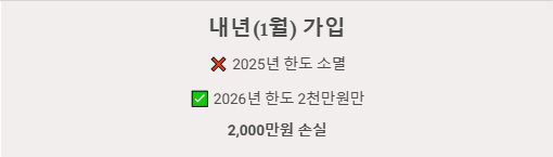 - 내년 1월 가입 시: 2025년 한도는 사라지고 2026년 한도(2천만 원)로 시작.