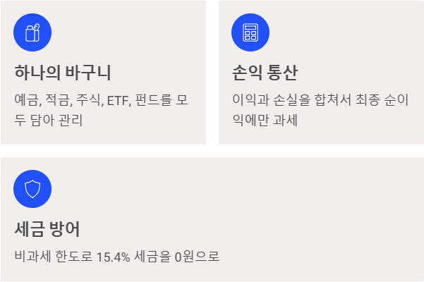 하나의 계좌 안에 예금, 적금, 주식, ETF, 펀드 등을 모두 담아 관리할 수 있는 '바구니'입니다.