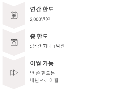 - 납입 한도는 연 2천만 원이지만, 안 쓴 한도는 내년으로 이월되어 최대 1억까지 늘어난다.