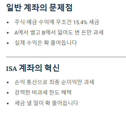- ISA 계좌: 이익과 손실을 합쳐(퉁쳐서) 최종 순이익에 대해서만 세금을 매깁니다. 여기에 강력한 isa 비과세 한도 혜택까지 더해지니 세금 낼 일이 확 줄어들죠.
