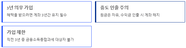 - 3년 의무 가입: 혜택을 받으려면 계좌를 3년간 유지해야 합니다.