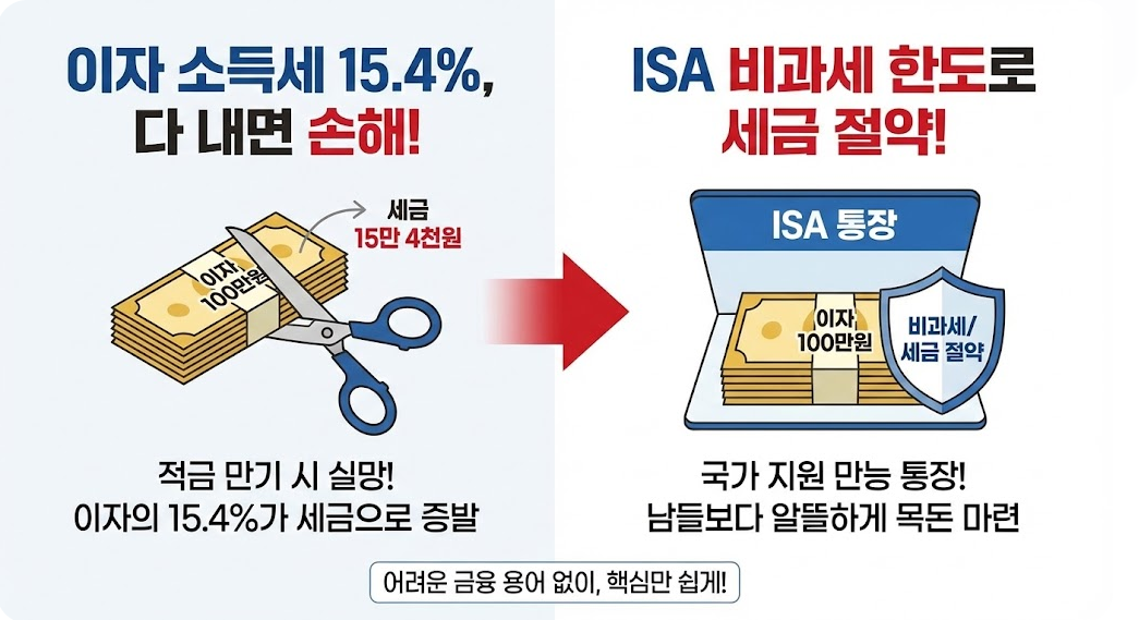 은행 이자에서 떼어가는 세금, 아깝지 않으신가요? ISA 비과세 한도를 제대로 알면 세금을 한 푼도 안 내거나 대폭 줄일 수 있습니다. '만능 통장'이라 불리는 ISA의 핵심 혜택과 서민형 가입 조건까지, 어려운 용어 없이 우리말로 쉽게 정리해 드립니다. 3분만 투자해서 숨은 돈을 찾아가세요.