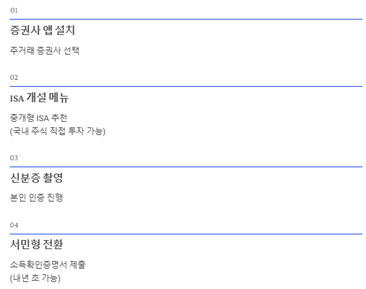 - 서민형 전환: 일단 일반형으로 개설 후, 내년 초 국세청 소득 자료가 연동되면 자동으로 전환되거나(증권사별 상이), 모바일로 소득확인증명서를 제출하여 전환하면 됩니다. 이렇게 하면 isa 비과세 한도를 400만 원까지 늘릴 수 있습니다.
