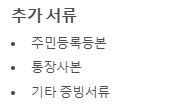 - 추가 서류: 주민등록등본, 통장사본 등