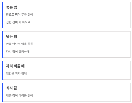- 놓는 법: 반으로 접어 무릎 위에 둡니다. (접힌 선이 배 쪽으로 오게 두는 것이 정석이나, 편하게 두셔도 무방합니다.)
