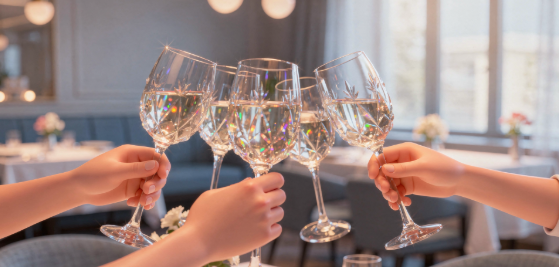 NO! 고급 와인잔은 매우 얇아 깨지기 쉽습니다. 눈을 마주치며 잔을 살짝 들어 올리는 것(Eye Contact)이