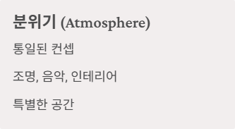 - ✨ 분위기 (Atmosphere): 조명, 음악, 테이블웨어(식기), 인테리어까지 하나의 컨셉으로 통일된 공간.